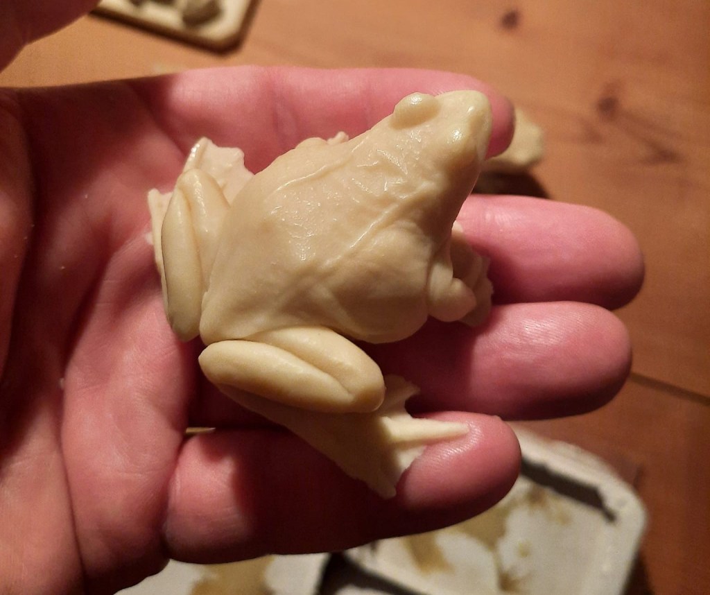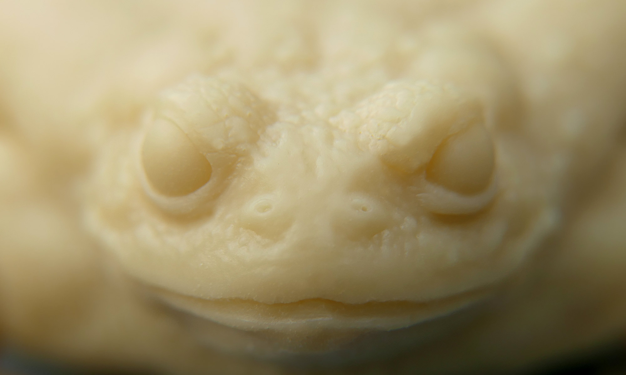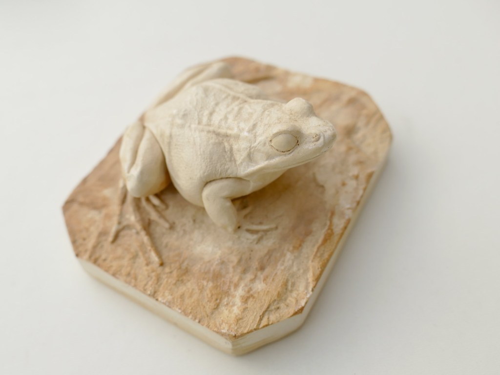 Originele Heikikker (Rana arvalis) in gips (1993). / Original Moor Frog (Rana arvalis) in plaster (1993).